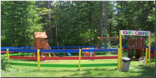 Kidz Corral – It’s the perfect place for your young children to spend some time away from the cabin/RV/tent. We have added a swing set and slide and a sand box.